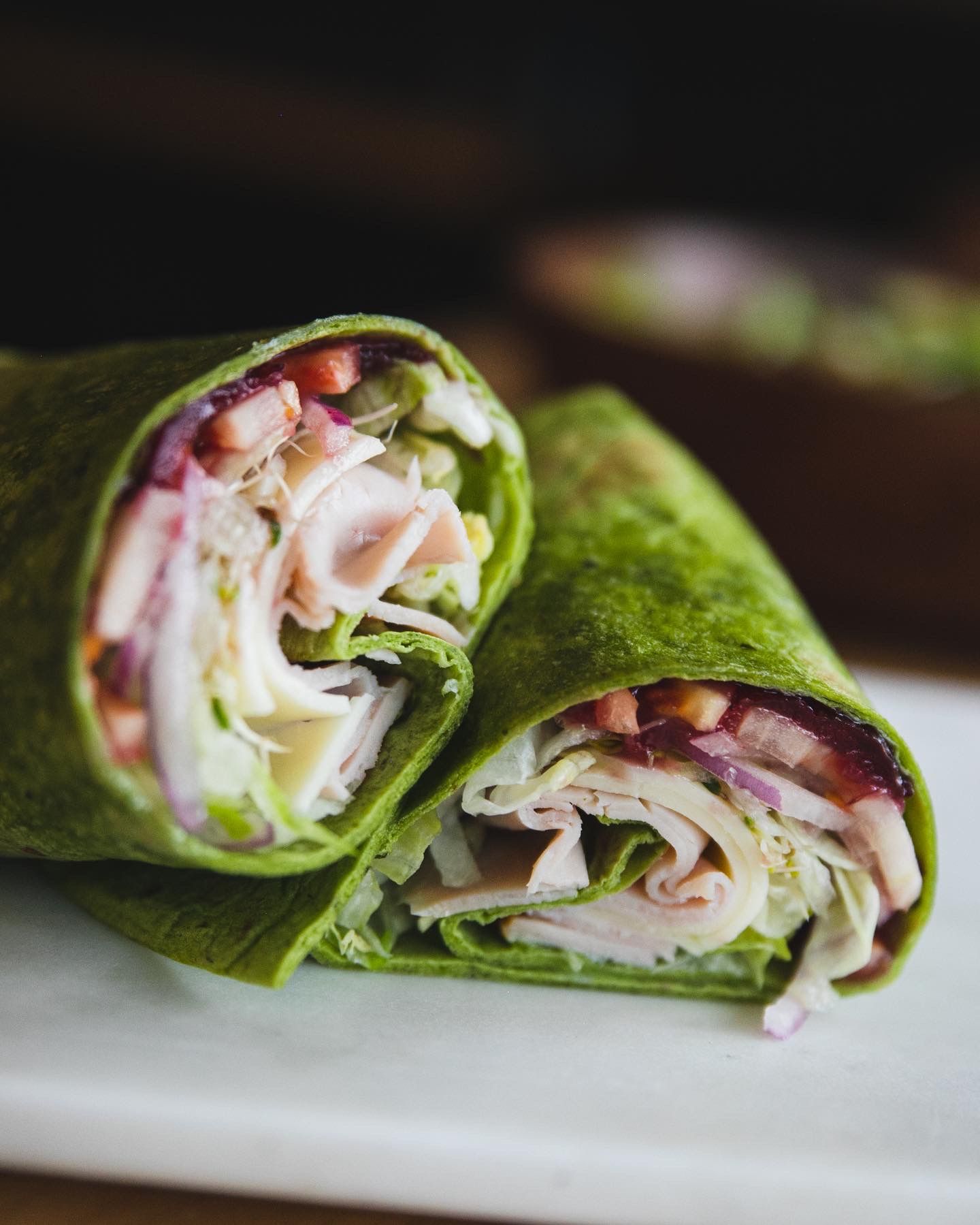 Maple-glazed turkey, provolone cheese, lettuce, sprouts, onions, & tomatoes, topped with a cranberry Dijon sauce on a spinach wrap