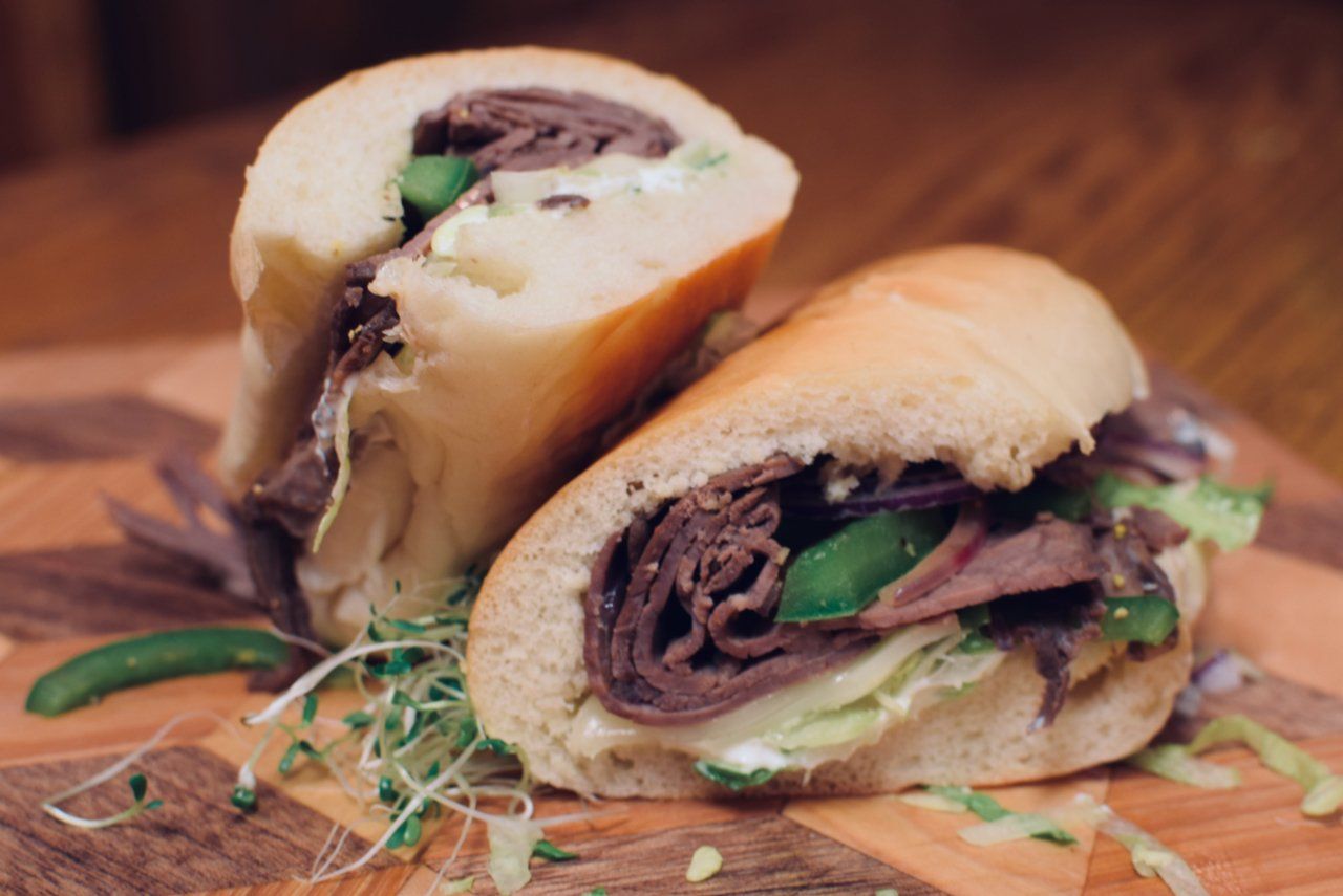 Double portion of seasoned roast beef, onions & green peppers, marinated in au jus & seasoned with lemon pepper, served with provolone cheese, lettuce & mayo