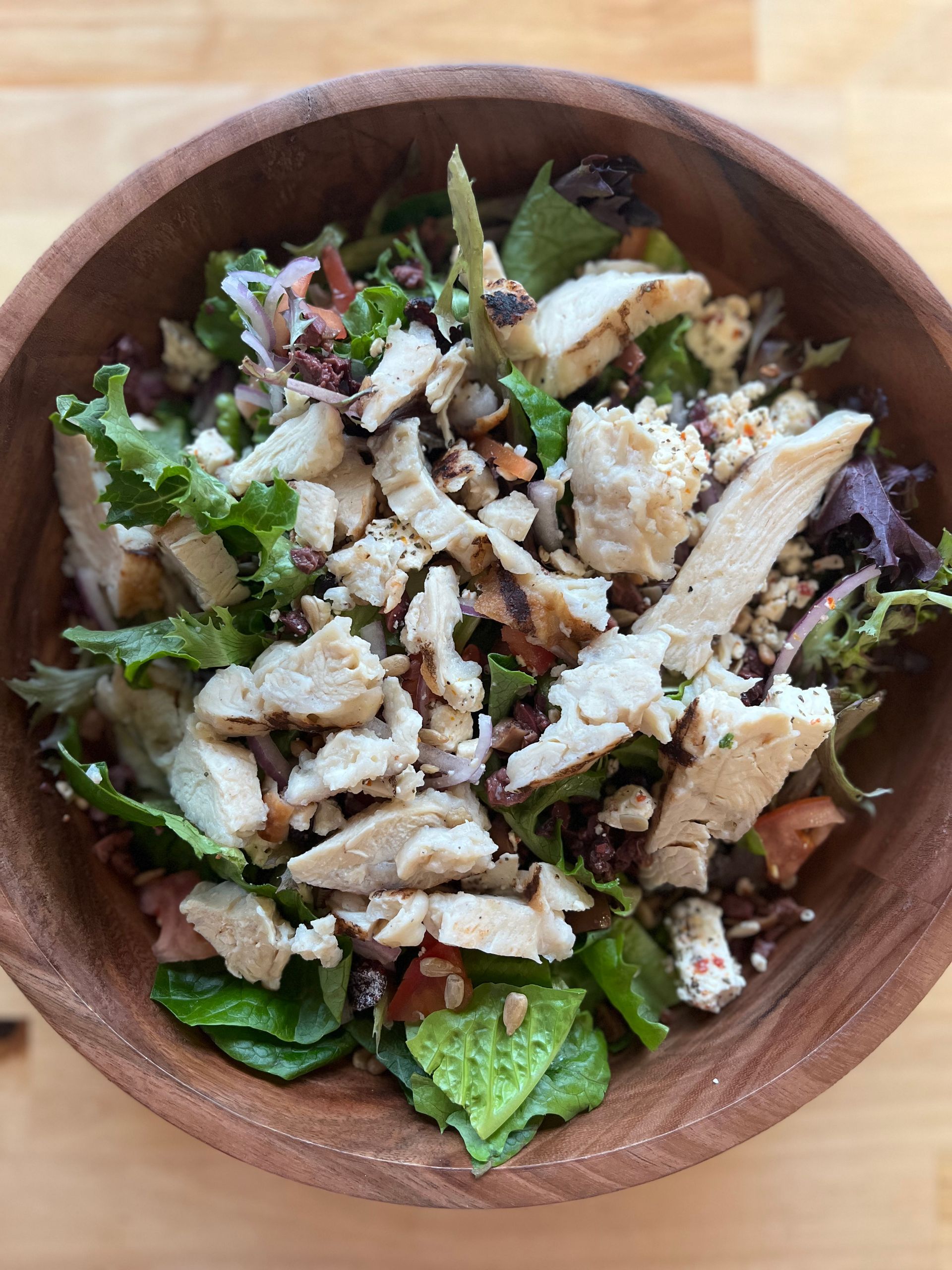 Chopped romaine with spring mix, grilled chicken breast, tomato/basil feta cheese crumbles, kalamata olives, dried cranberries, sunflower nuts, onion & tomato