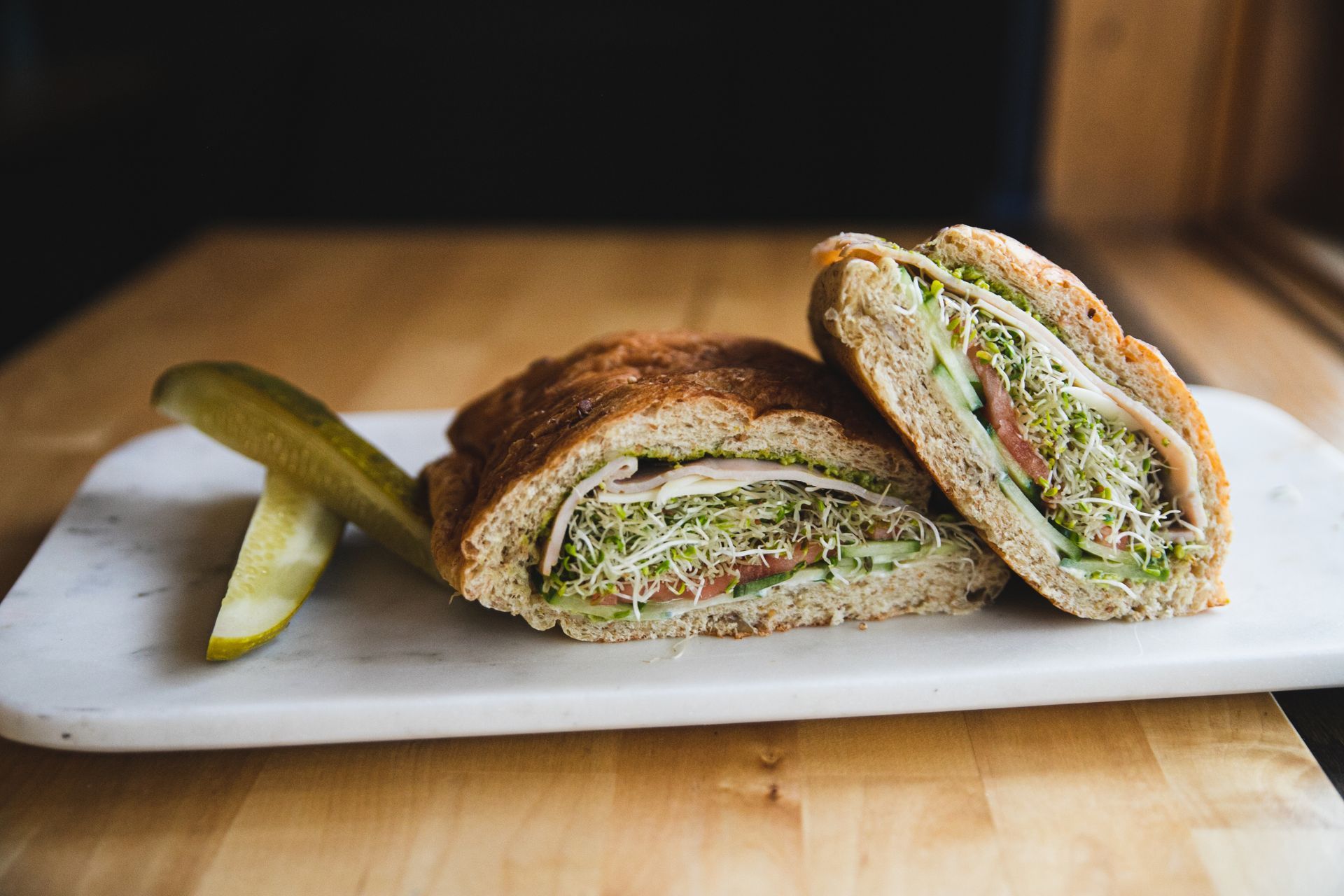 Smoked maple-glazed turkey, cheddar cheese, provolone cheese, avocado spread, lettuce, sprouts, tomato & mayo