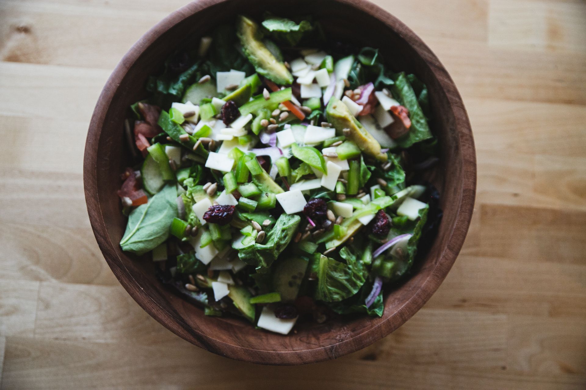 Chopped romaine with spring mix, fresh avocado, provolone cheese, cucumber, green pepper, tomato, sprouts, onion, topped with dried cranberries and sunflower nuts